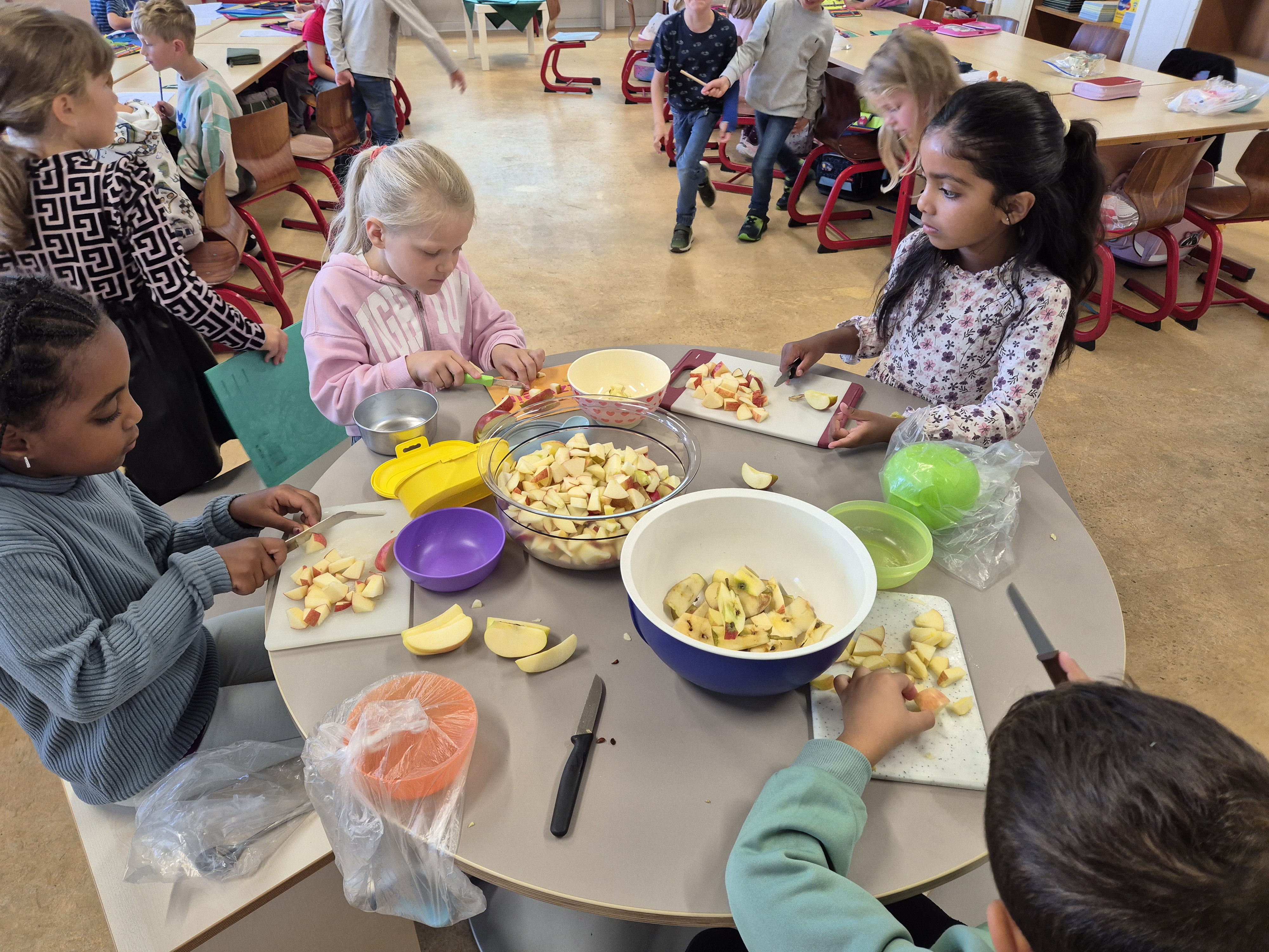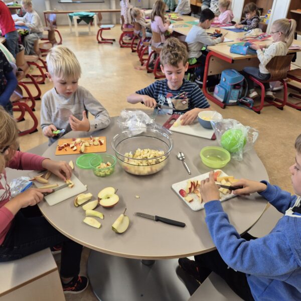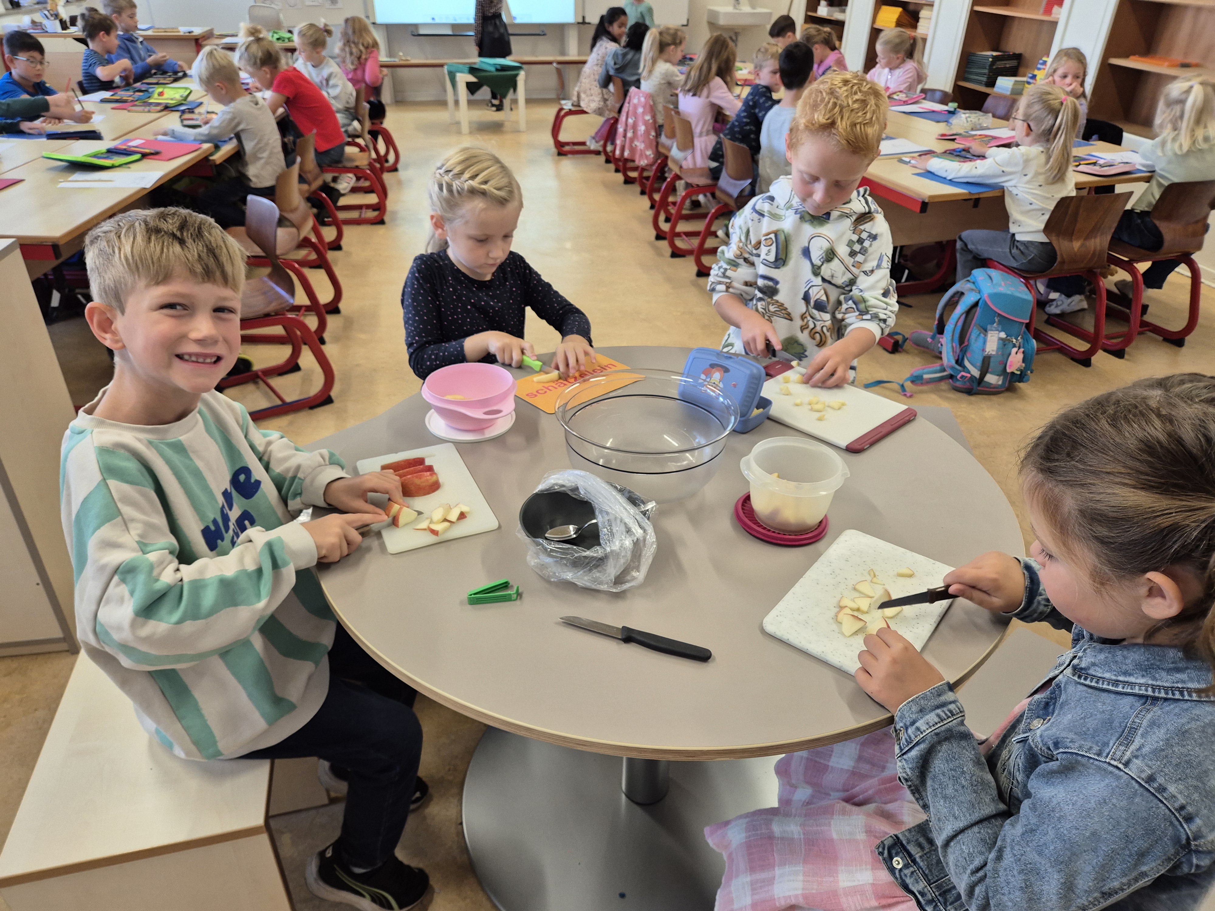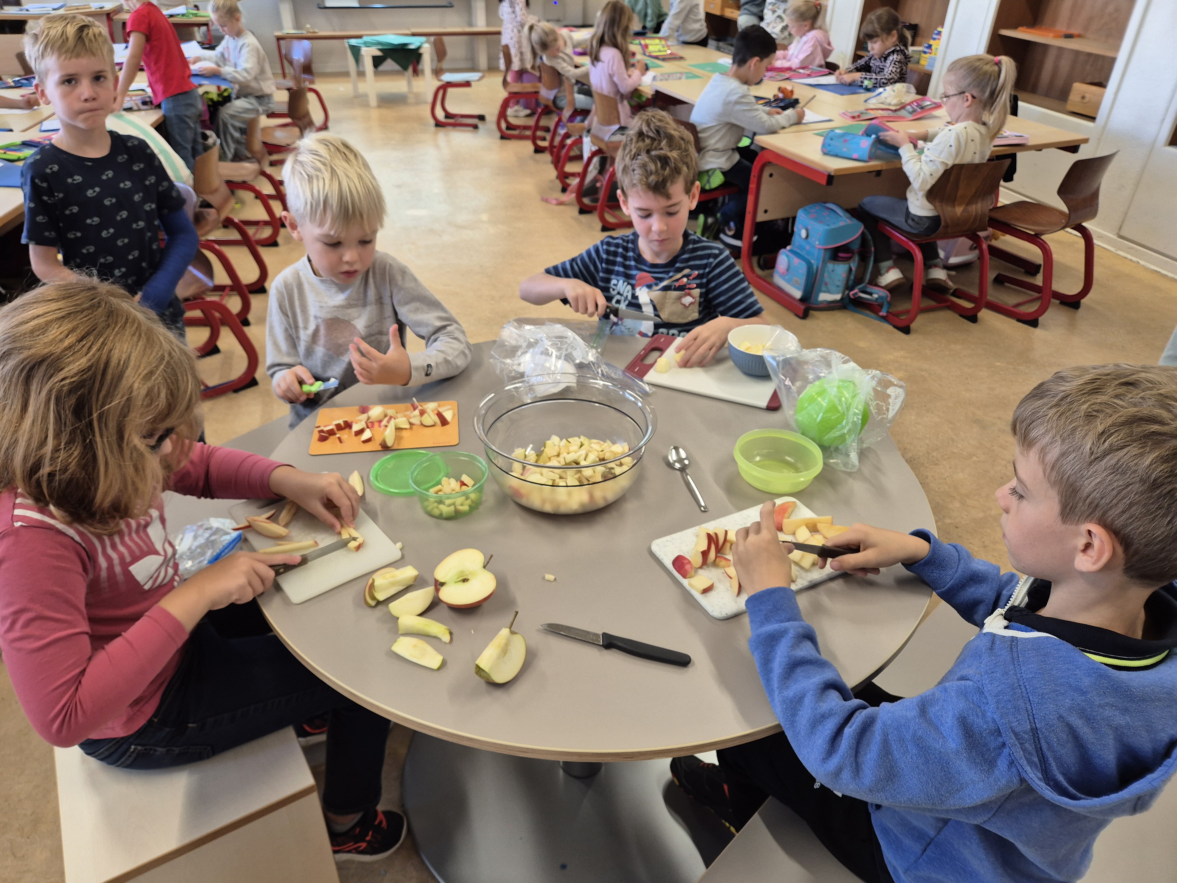 Als das A,a Geburtstag hatte, haben wir mit der ganzen Klasse einen leckeren Apfelsalat gemacht.