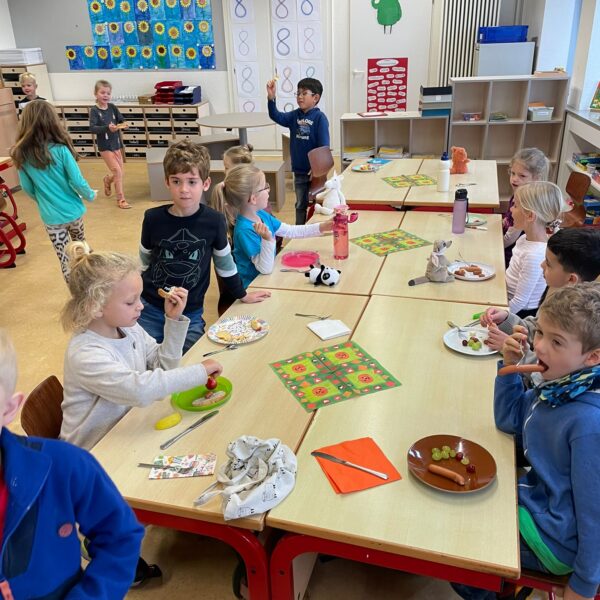 Dann sind alle in die Kirche gegangen. Dort haben wir einen Erntedankgottesdienst gefeiert. Anschließend haben wir in der Schule das tolle Buffet bestaunt, was einige Eltern sehr schön hergerichtet haben. Wir konnten uns bedienen und haben sehr gemütlich und lange gemeinsam in den Klassen gegessen. Das war ein toller Tag!