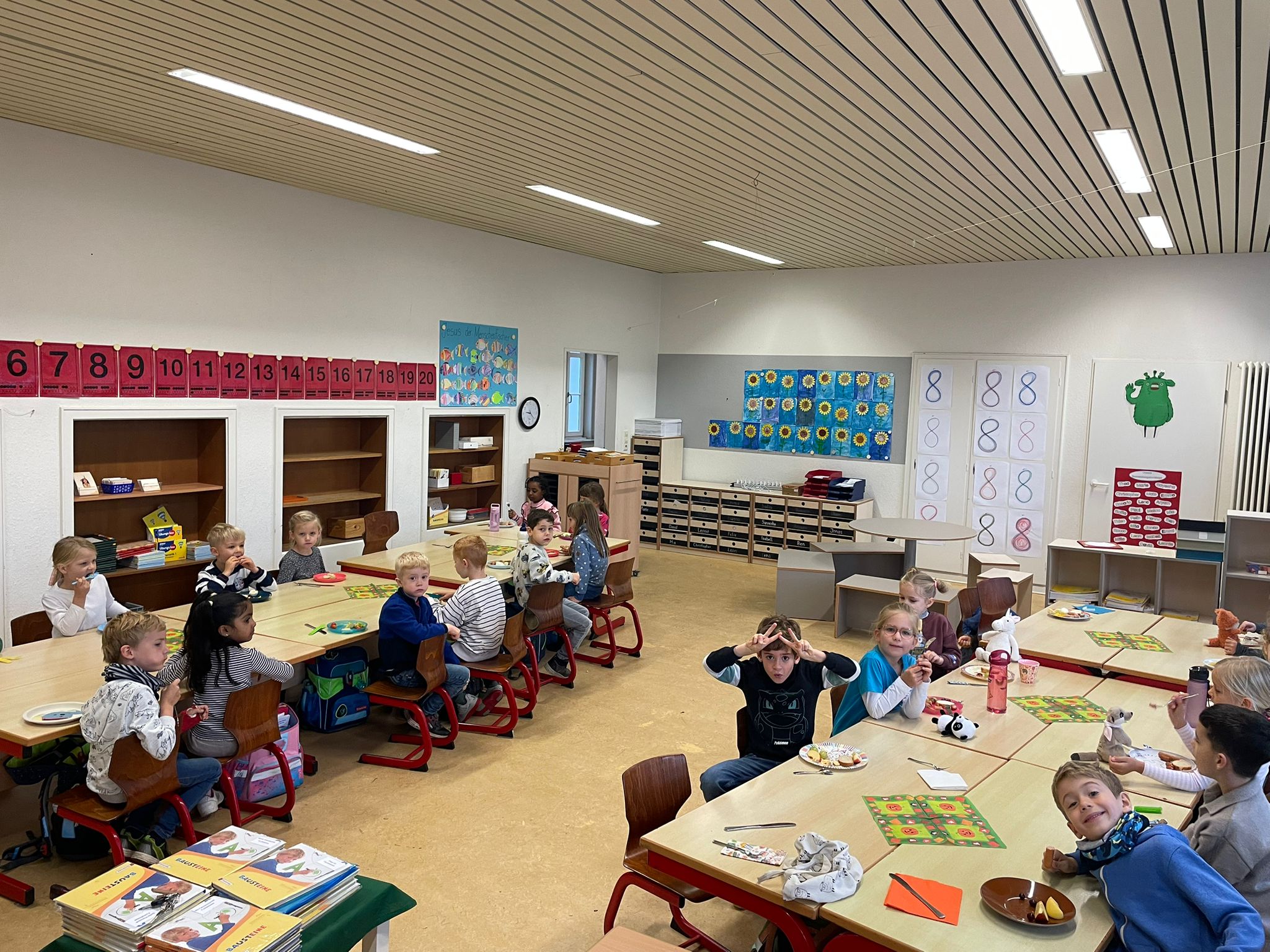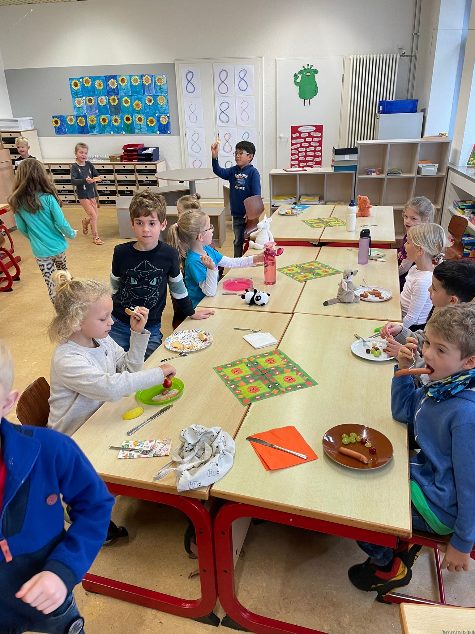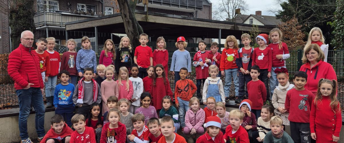 Immer, wenn wir einen Buchstaben gut schreiben, lesen und heraushören können, dann feiert der Buchstabe Geburtstag und bringt etwas mit. Heute hatte das R Geburtstag. Zu diesem Anlass haben wir uns alle etwas rotes angezogen und gemeinsam mit der Gepardenklasse einen Rottag gefeiert.