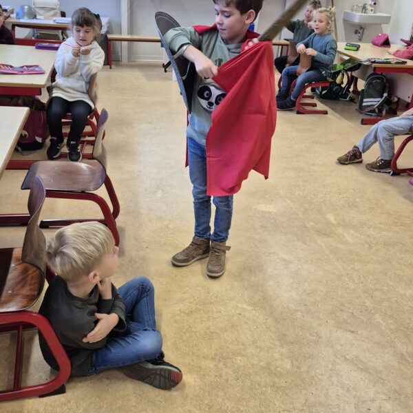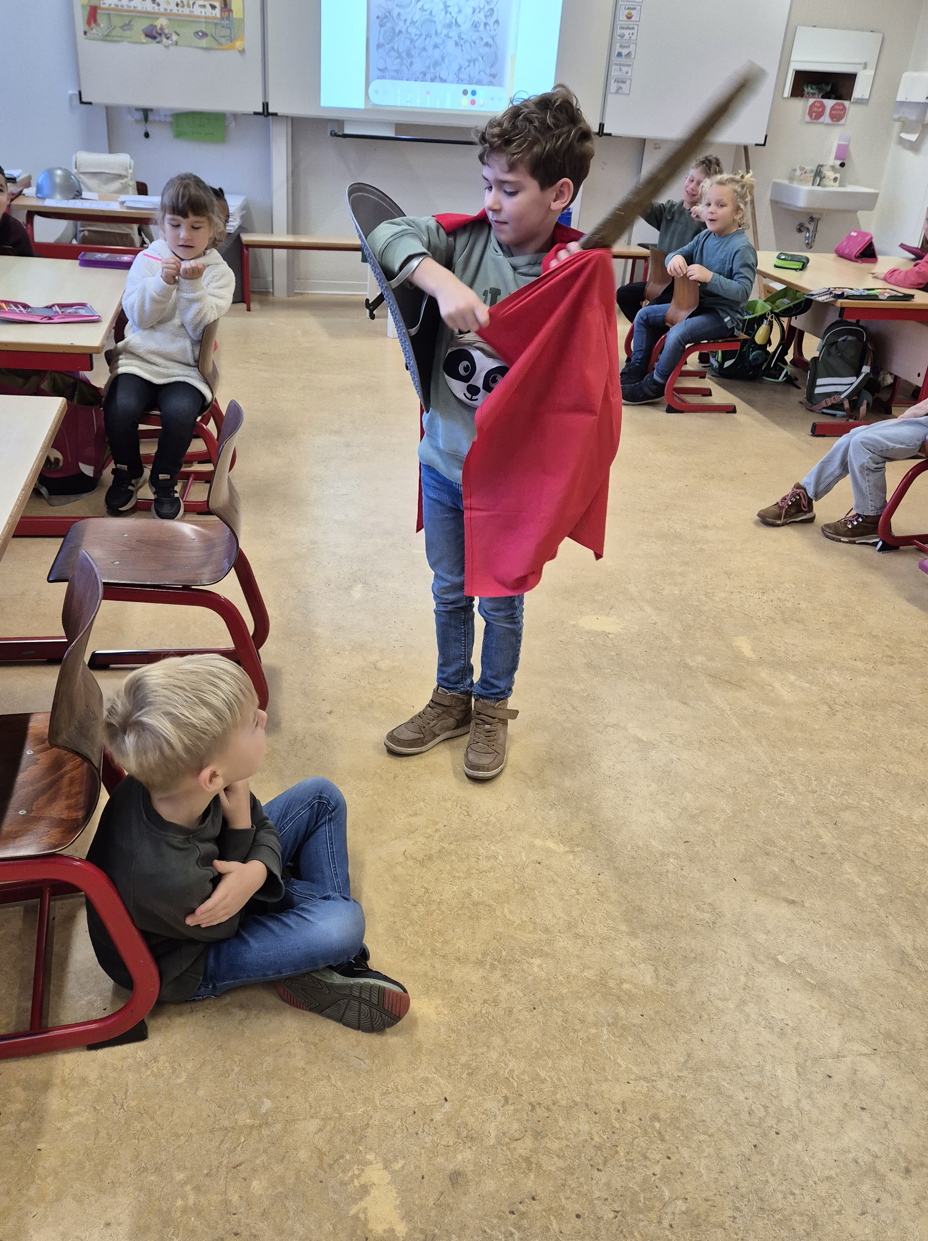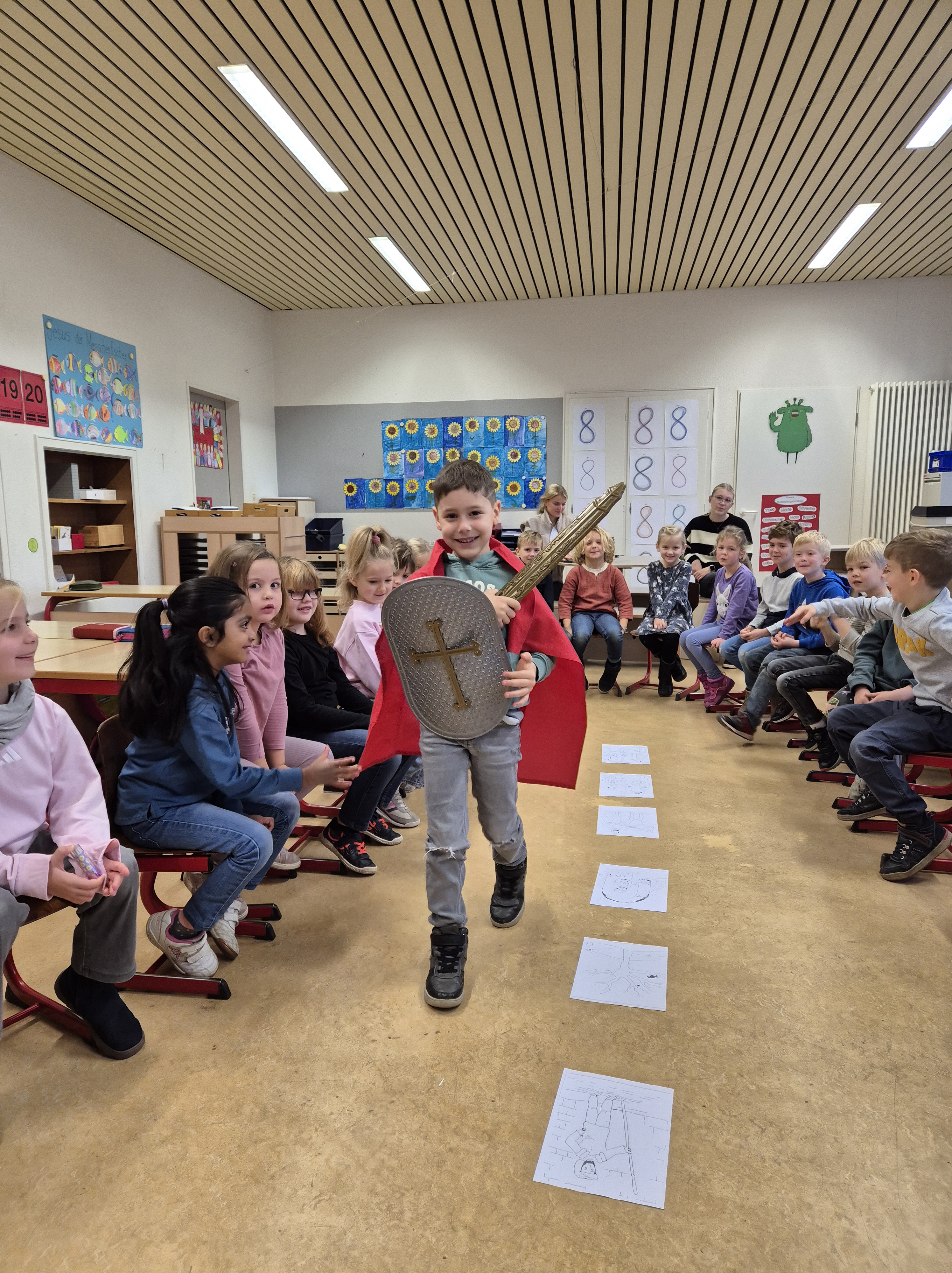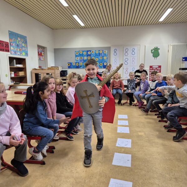 Im Religionsunterricht haben wir die Erzählung von Sankt Martin gehört. Anschließend haben wir die Geschichte nachgespielt und Martinslieder gesungen.
