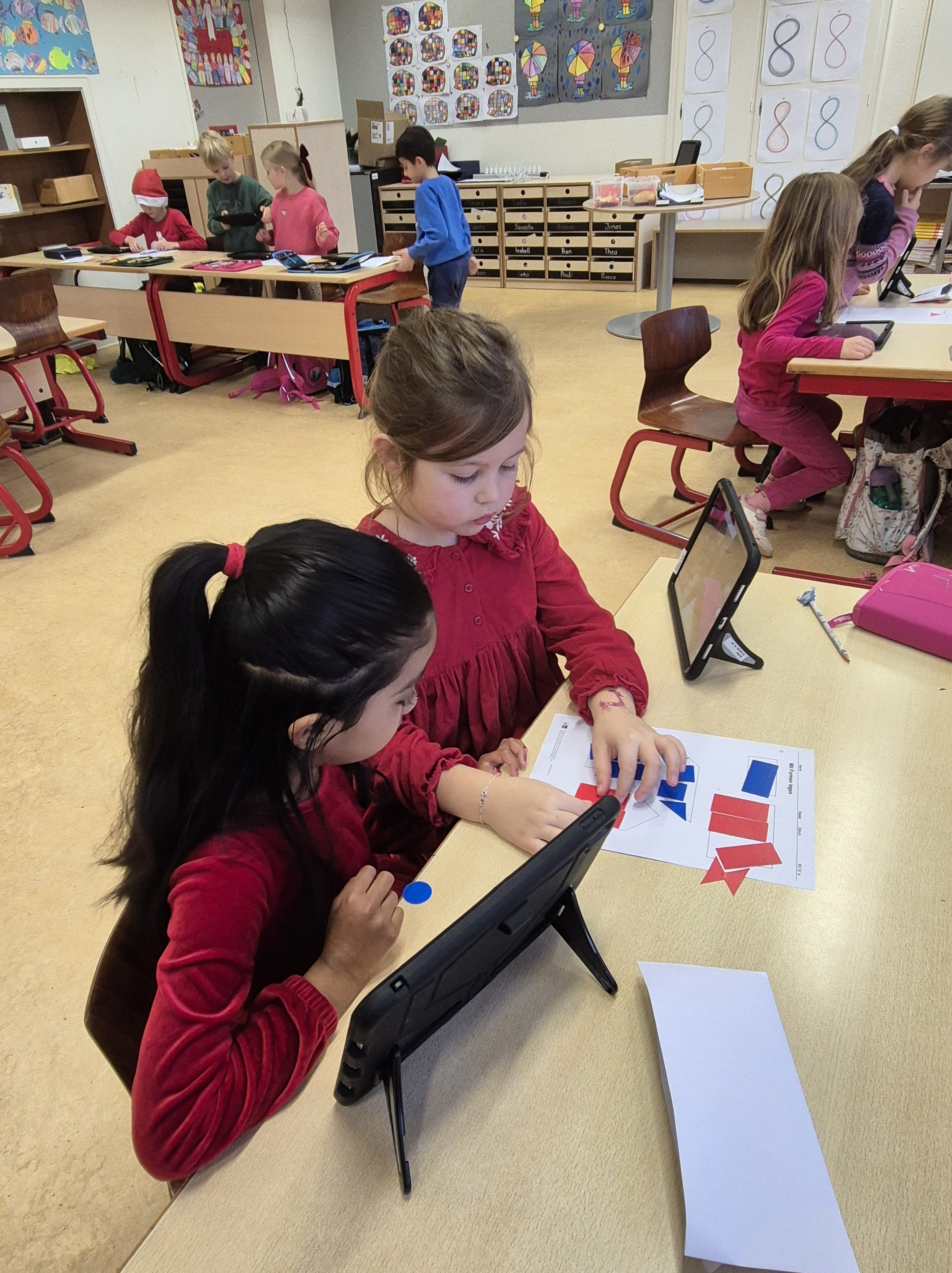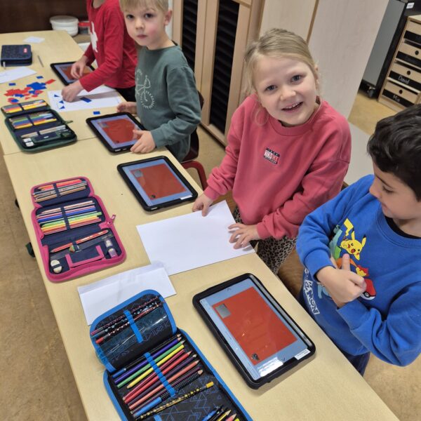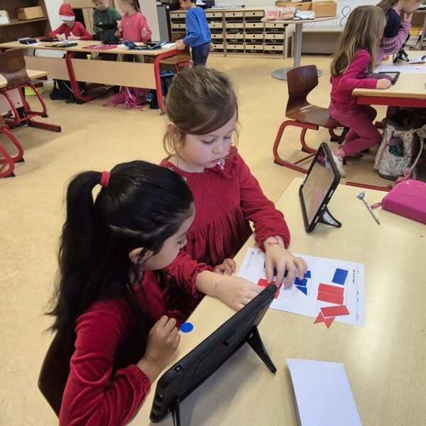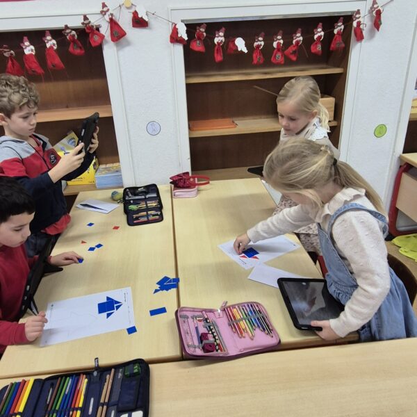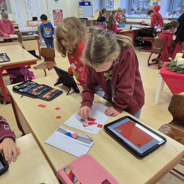 Im Matheunterricht haben wir zu Formen wie Quadrate, Rechtecke, Dreiecke und Kreise gearbeitet. Wir haben Formen ausgelegt und in der Schule diese Formen gesucht und fotografiert. Mit unserem Tablet haben wir alles fotografiert und in einem Buch in der App Book Creator gespeichert.