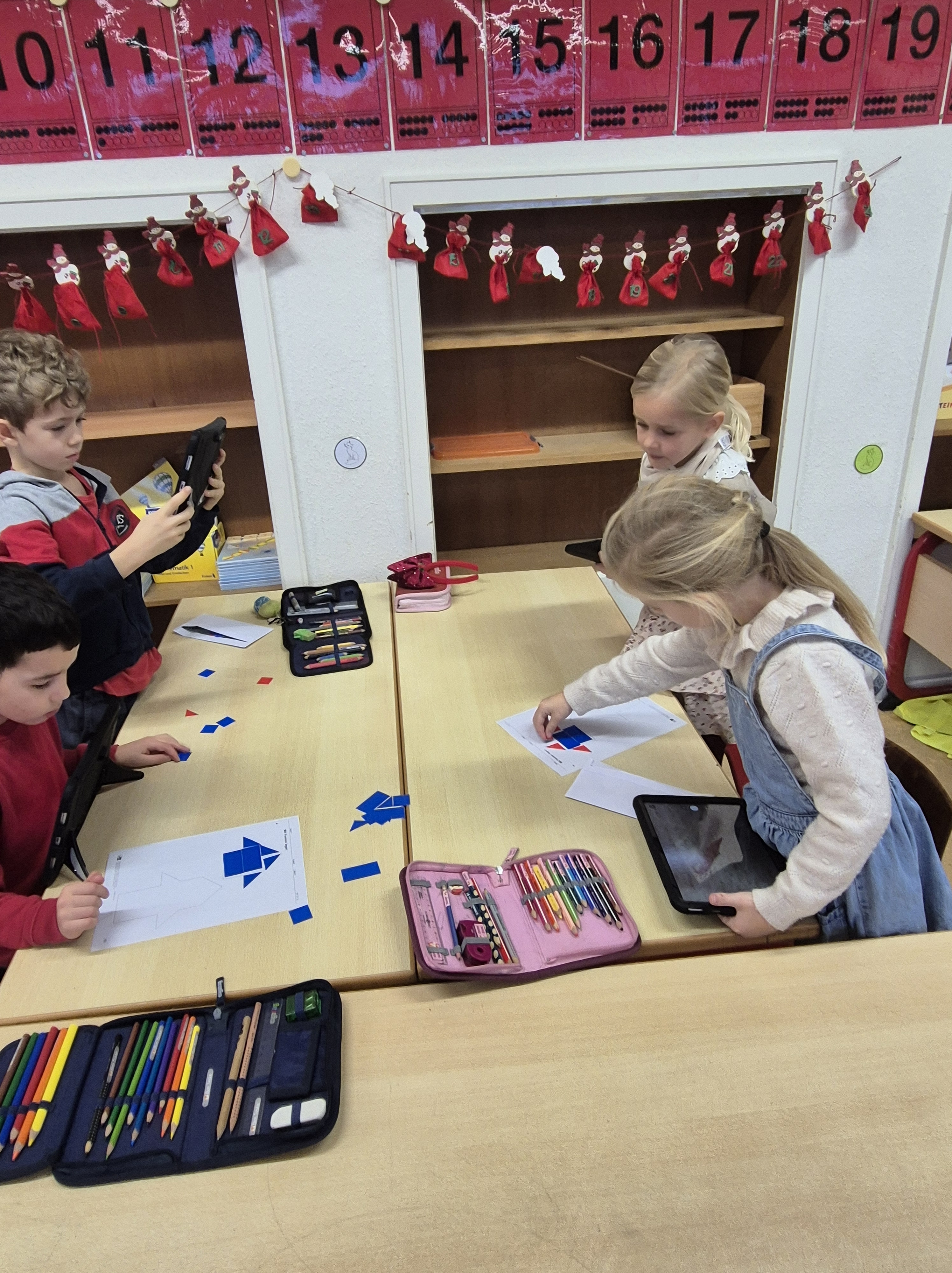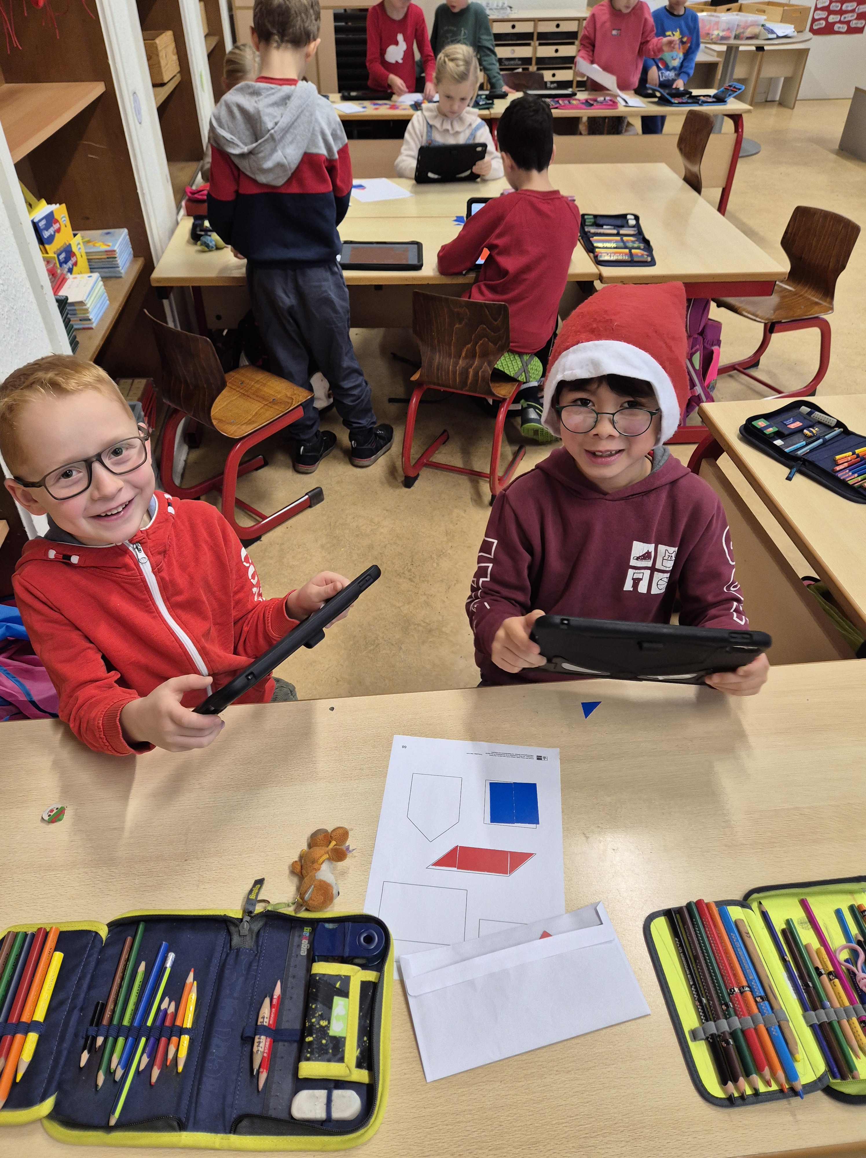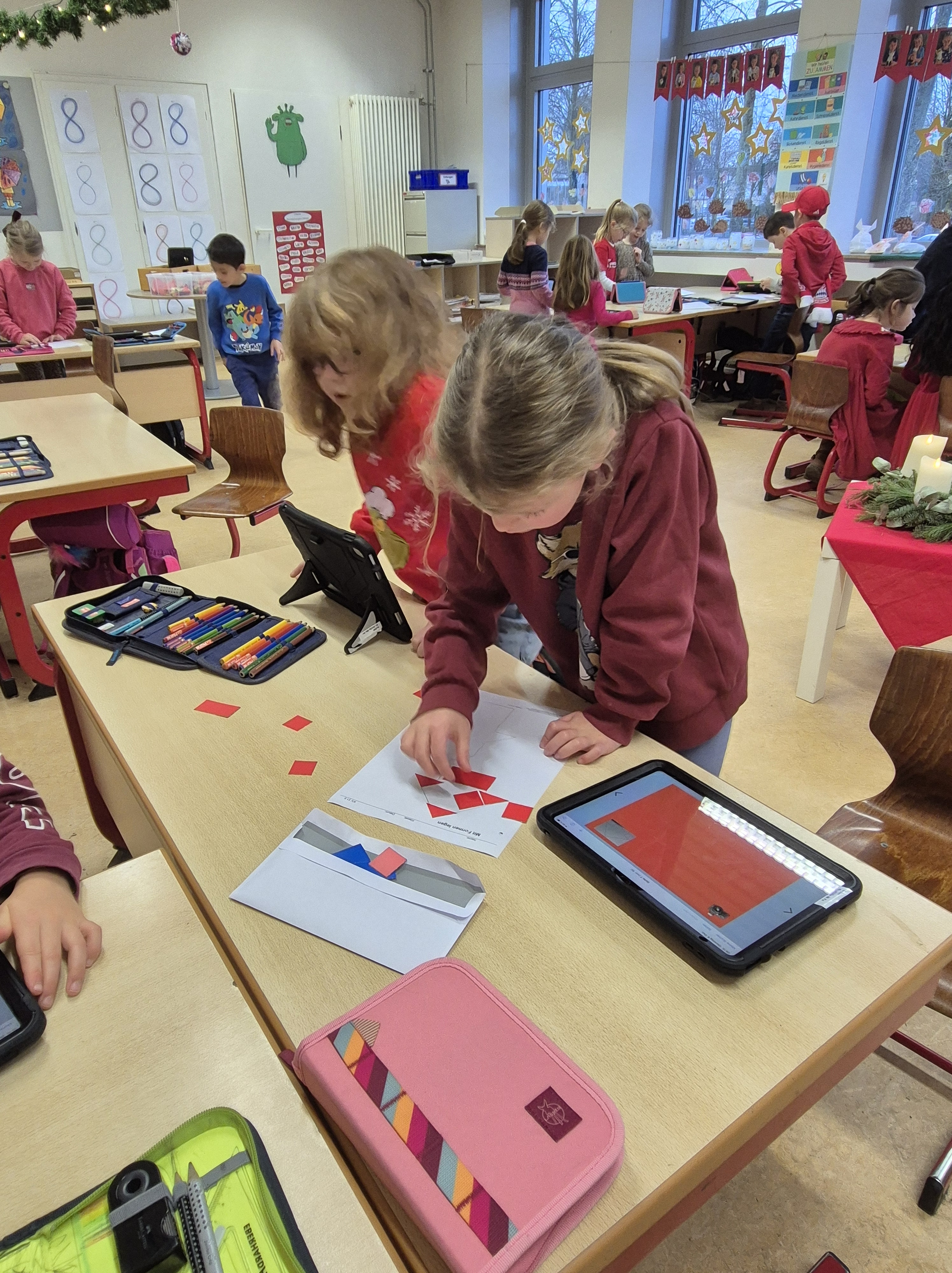 Im Matheunterricht haben wir zu Formen wie Quadrate, Rechtecke, Dreiecke und Kreise gearbeitet. Wir haben Formen ausgelegt und in der Schule diese Formen gesucht und fotografiert. Mit unserem Tablet haben wir alles fotografiert und in einem Buch in der App Book Creator gespeichert.