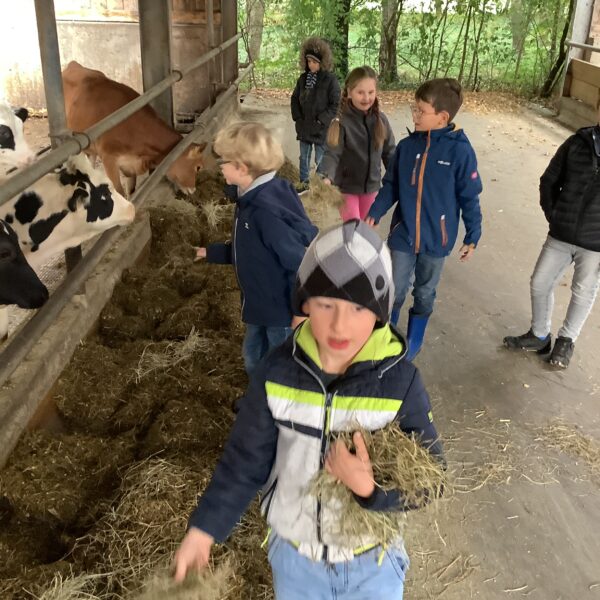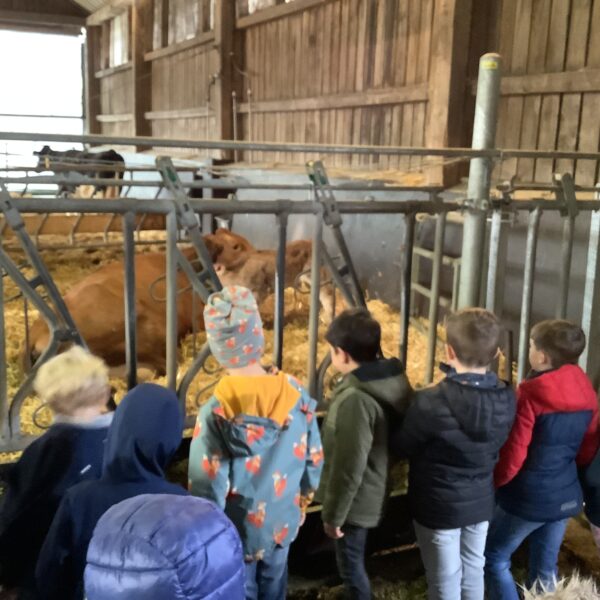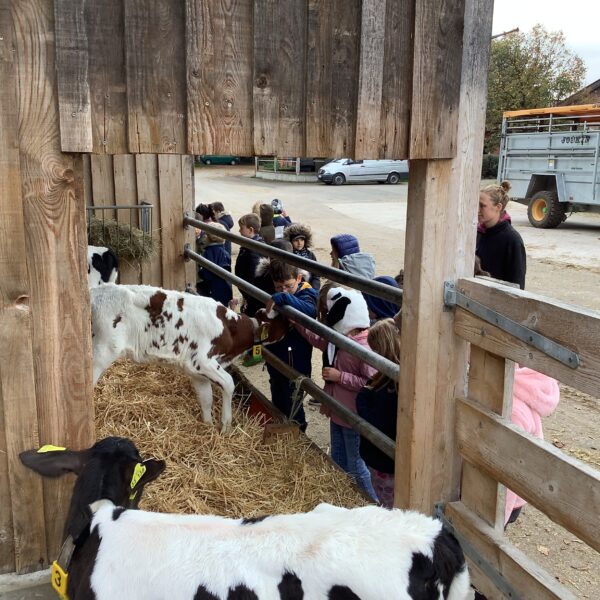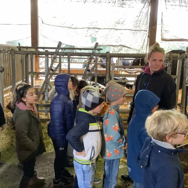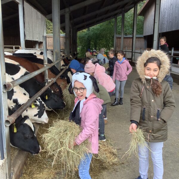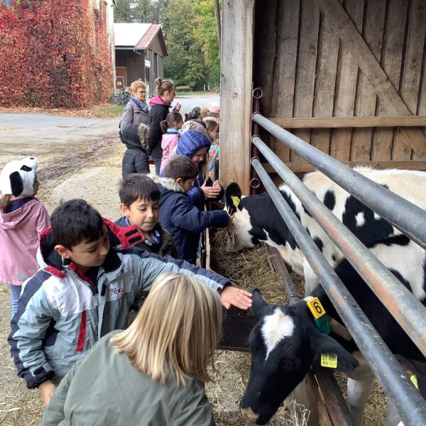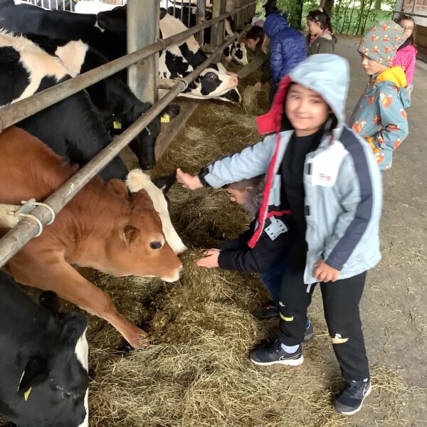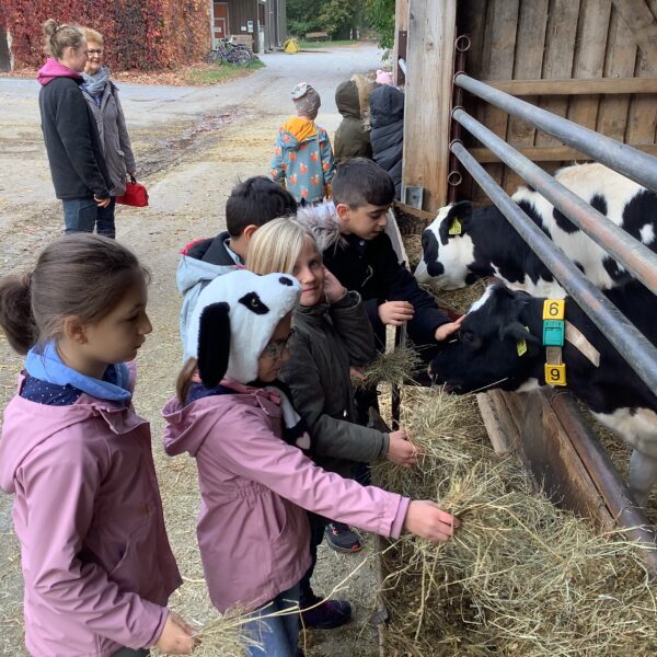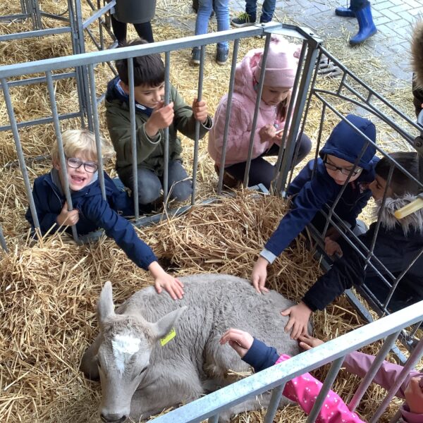 Wir konnten uns ein Kälbchen ansehen, das gerade erst wenige Stunden alt war. Dann gingen wir in den „Kälbchen-Kindergarten“ und die „Schule“. Wir konnten die Tiere streicheln und füttern und hatten einen sehr schönen Schultag.