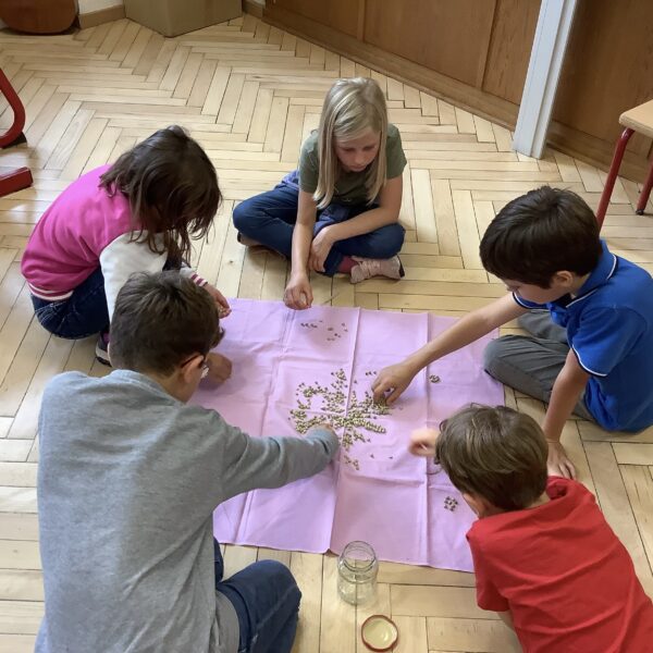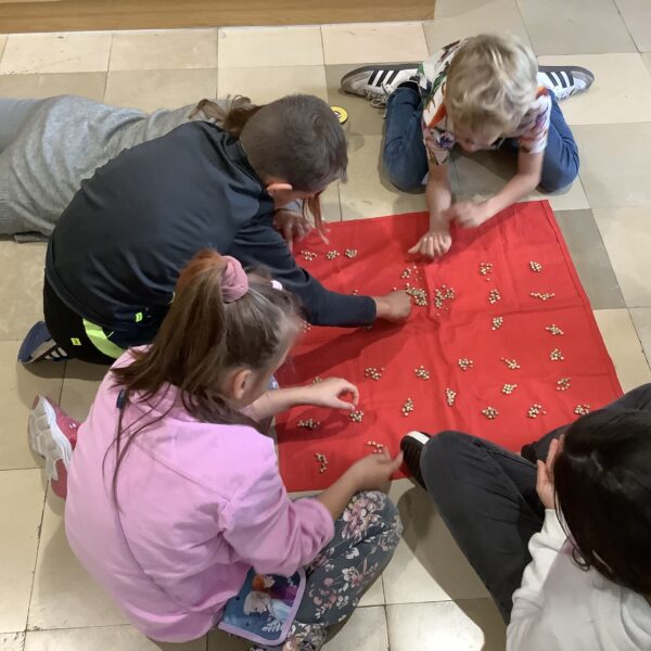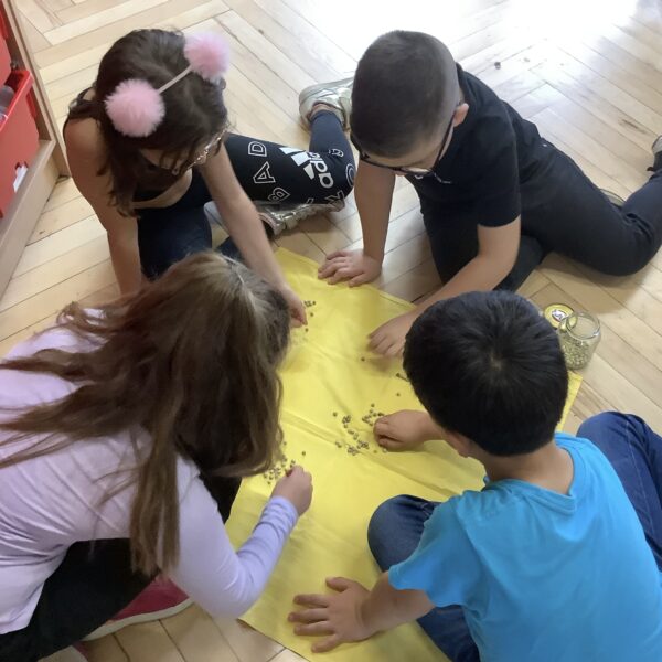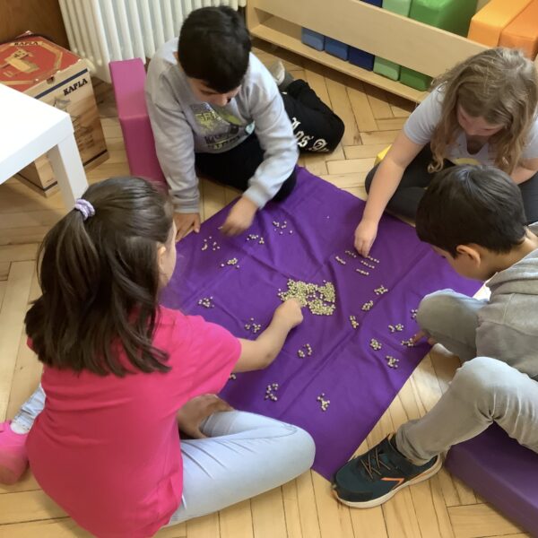 Um herauszufinden, wie viele Erbsen in einem mitgebrachten Glas sind, haben wir uns in Gruppen zusammengefunden und überlegt, wie wir die genaue Anzahl bestimmen können. Das war gar nicht so einfach! Aber durch geschicktes Zählen und Bündeln in Zehner und Hunderter haben wir es gemeinsam geschafft!
