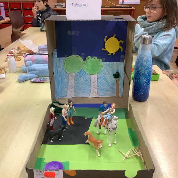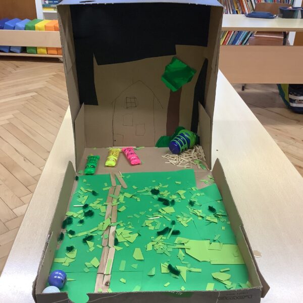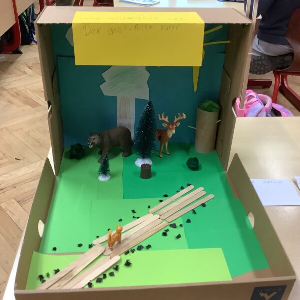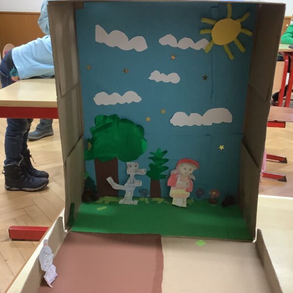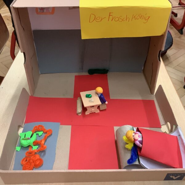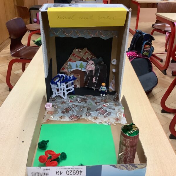 Im Advent haben wir uns im Deutschunterricht mit dem Aufbau von Märchen beschäftigt und mit einem roten Faden eine Technik geübt, mit der man eine Geschichte gut und möglichst vollständig nacherzählen kann. Passend dazu haben wir im Kunstunterricht in Kleingruppen einen Schaukasten zu unserem Märchen gebaut.
