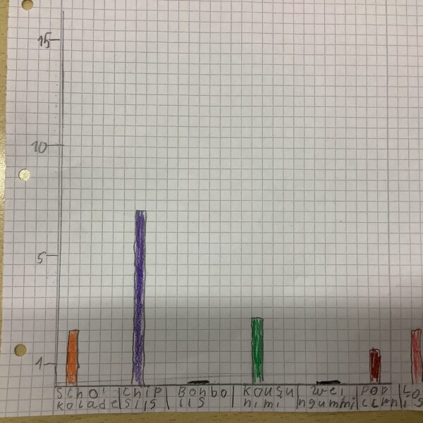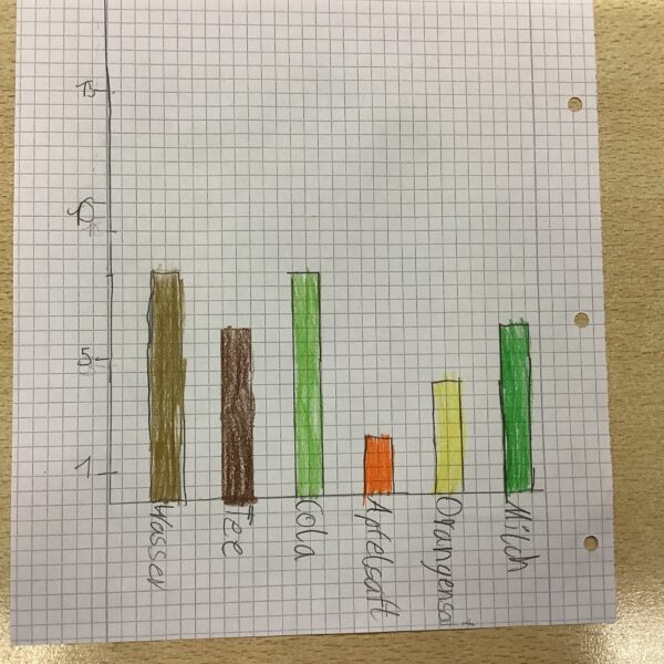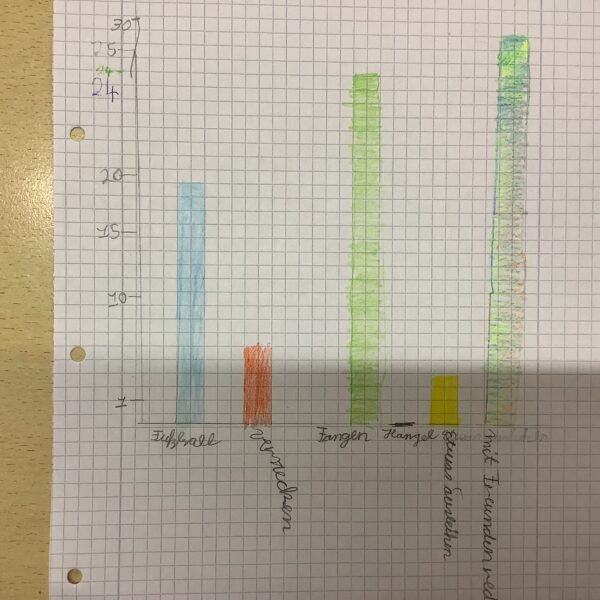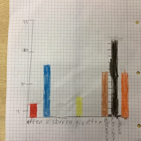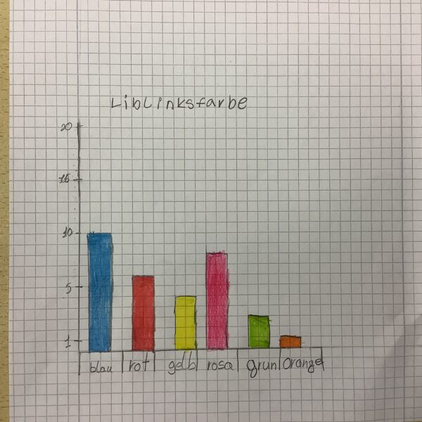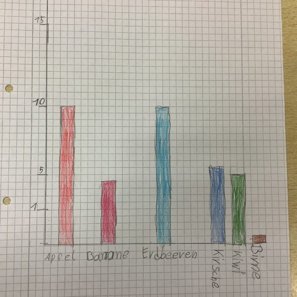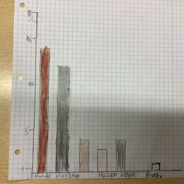 Im Deutschunterricht haben wir in unserer Klasse verschiedene Befragungen durchgeführt. Jeder durfte auf Zetteln Striche machen, welches sein Lieblingshaustier ist oder welches Obst er am liebsten mag. Die Ergebnisse haben wir dann in Diagrammen dargestellt.
