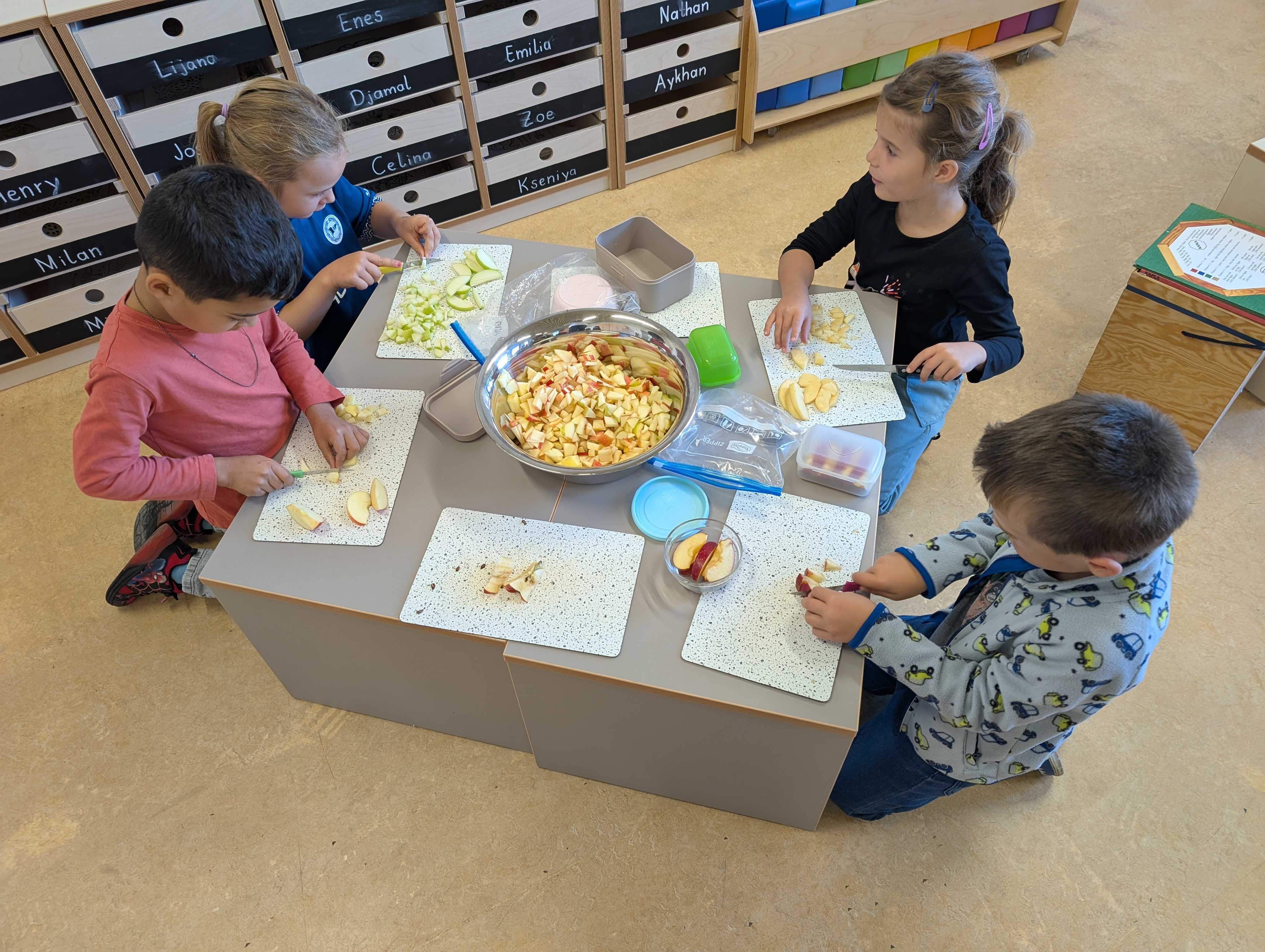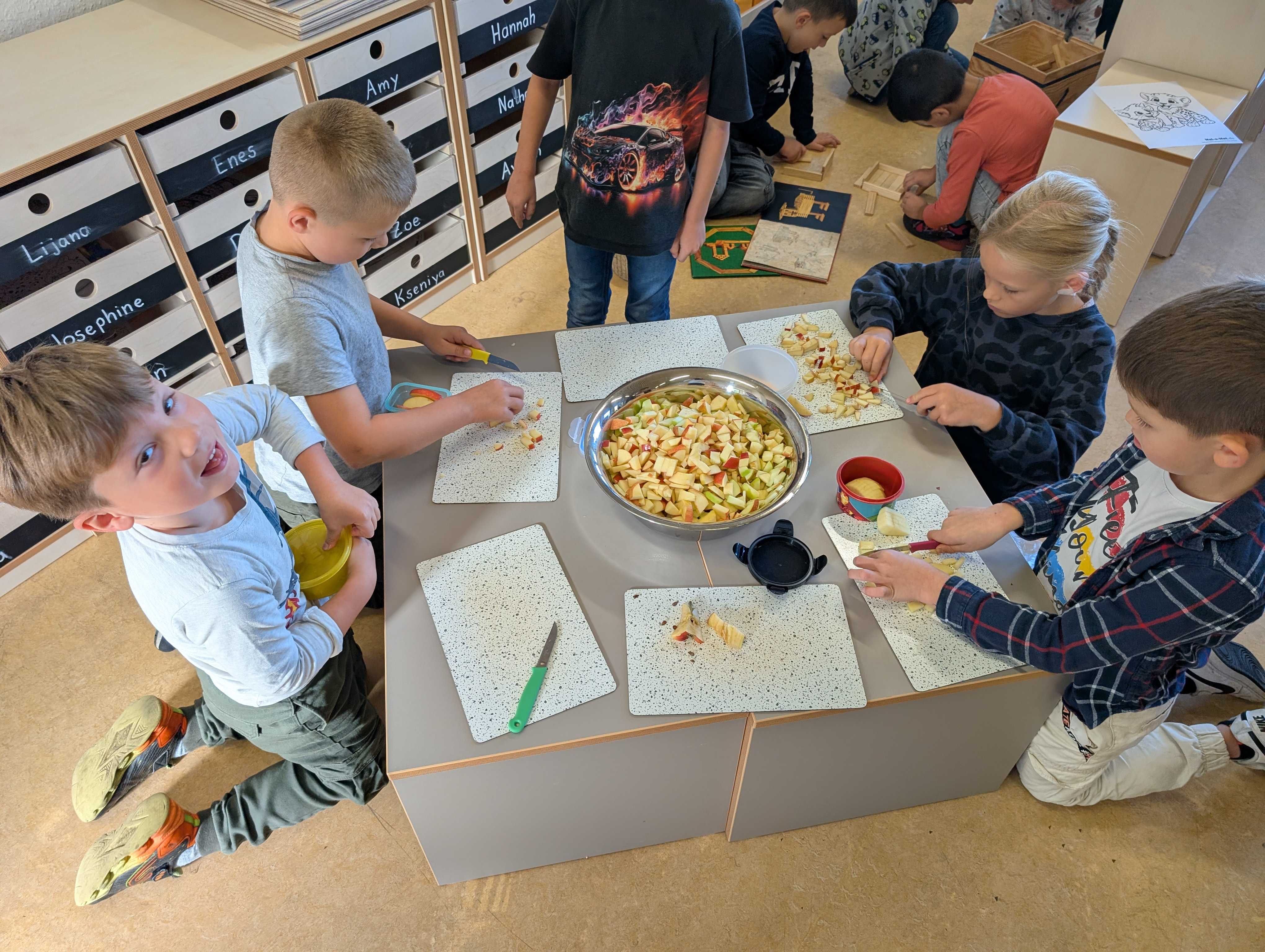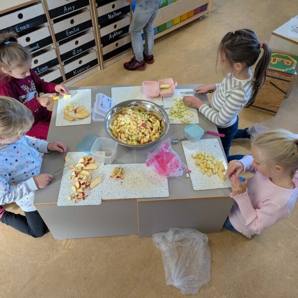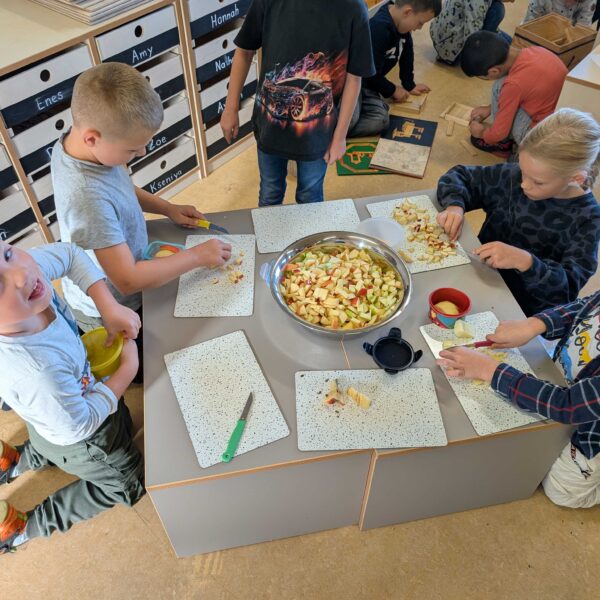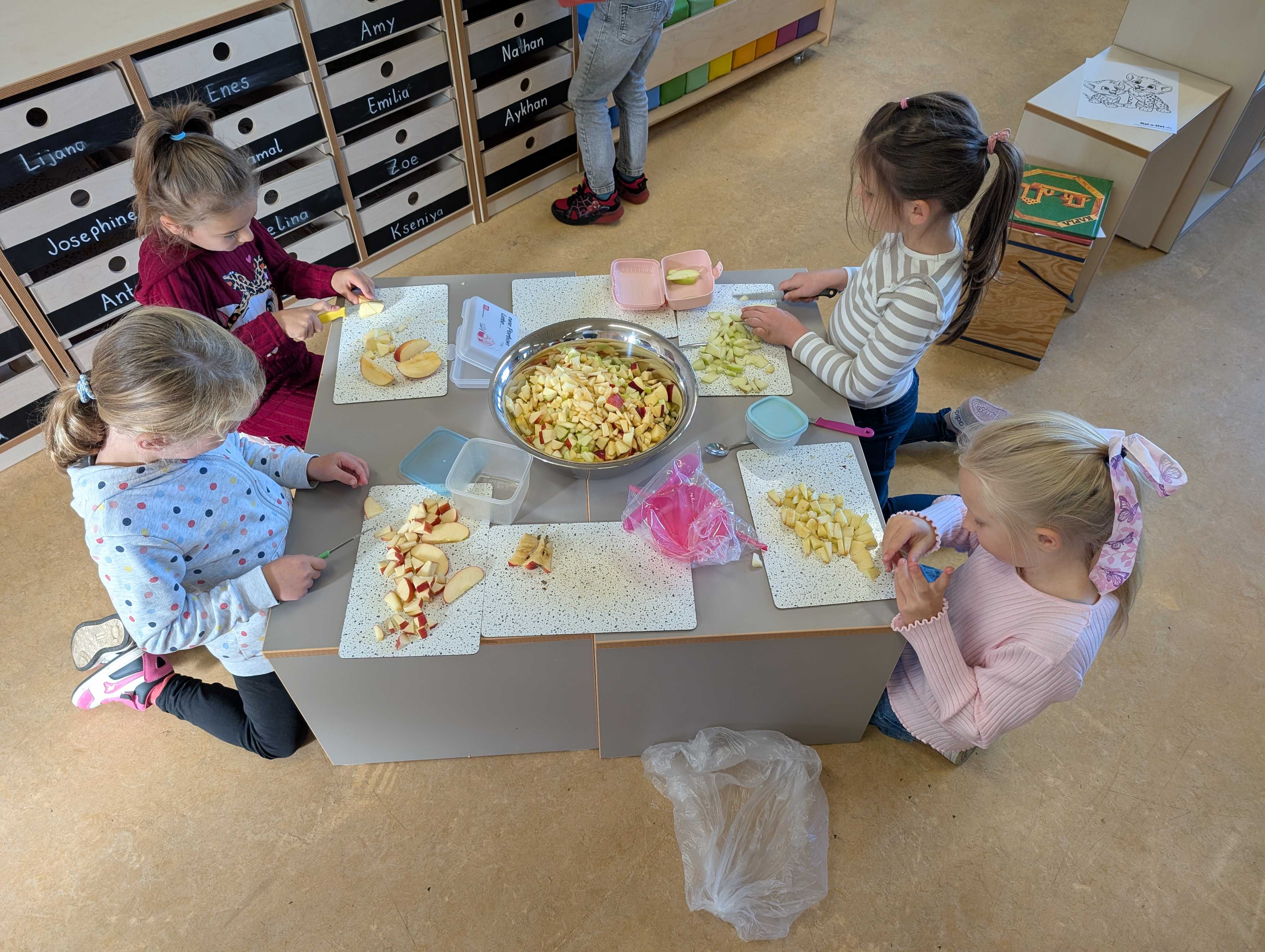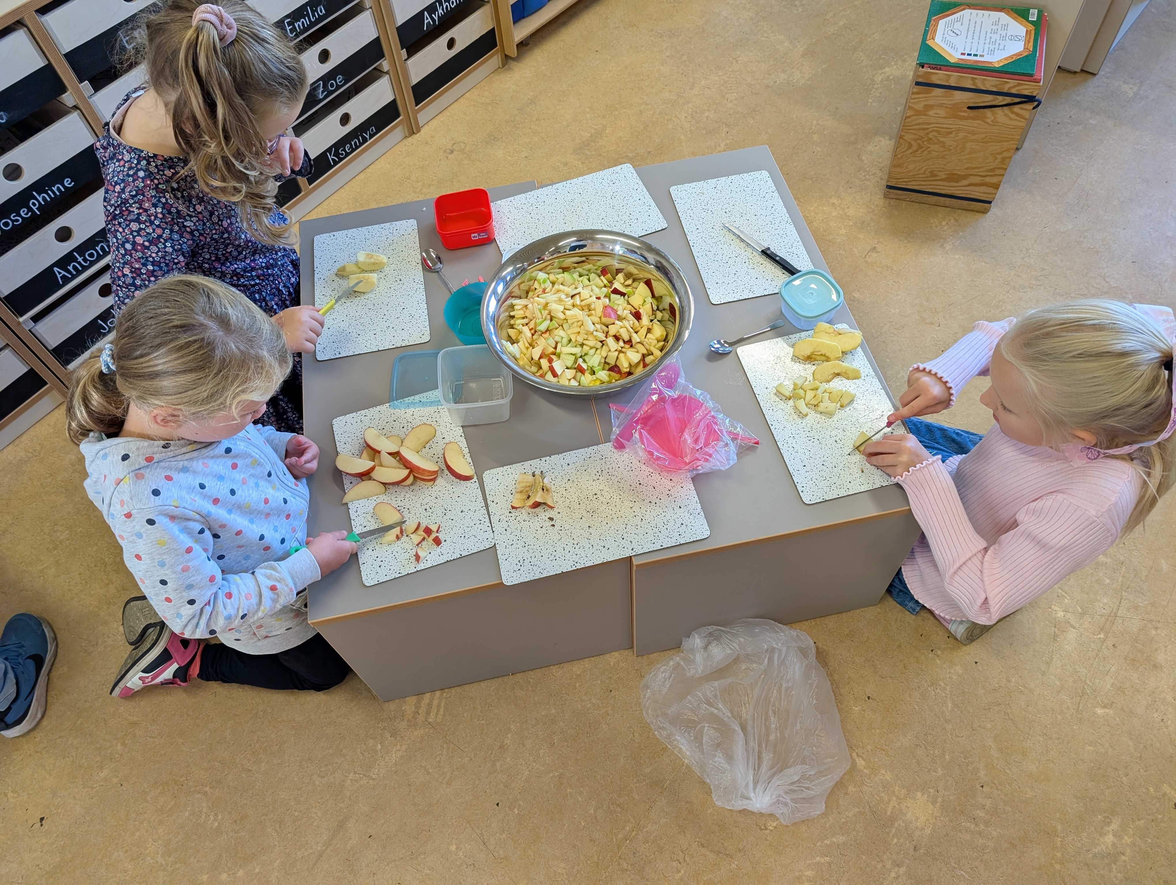 Den haben wir in kleinen Stücke geschnitten. Zum Schluss hatten wir eine große Schüssel mit Apfelsalat. Der war vielleicht lecker.