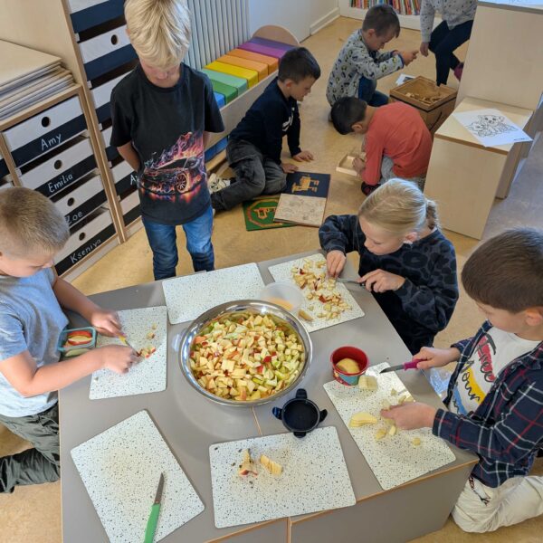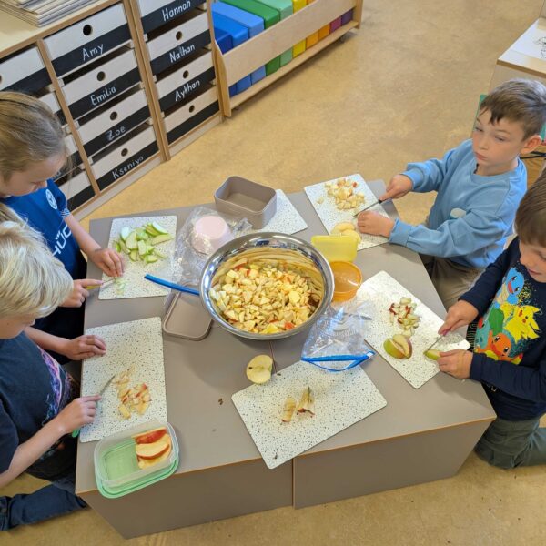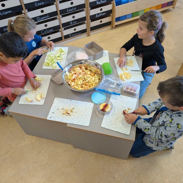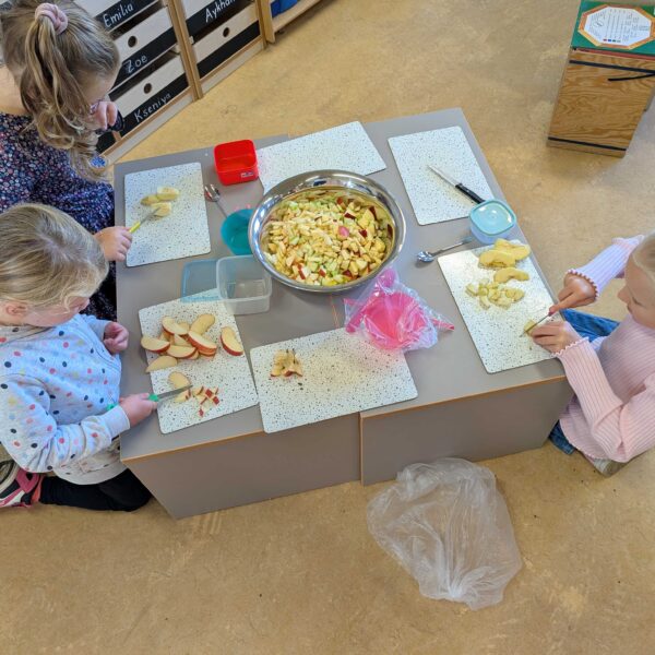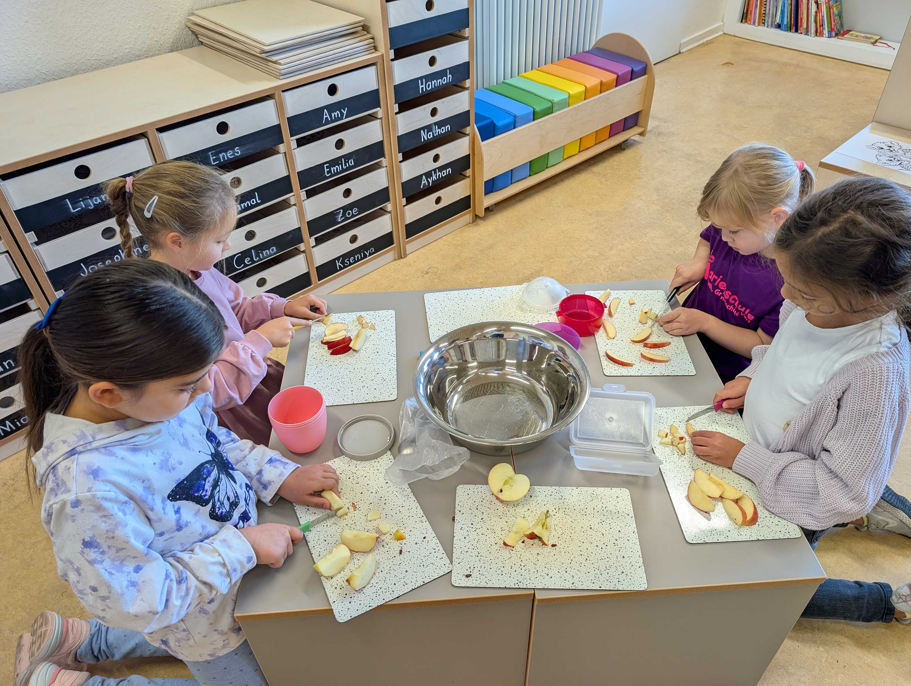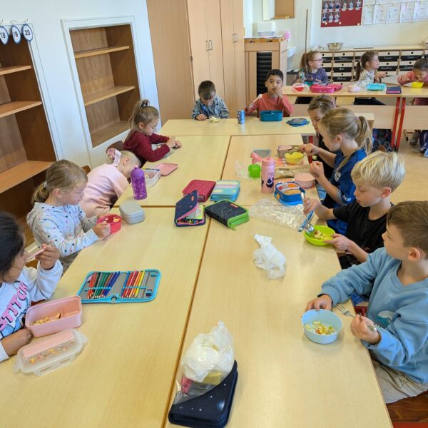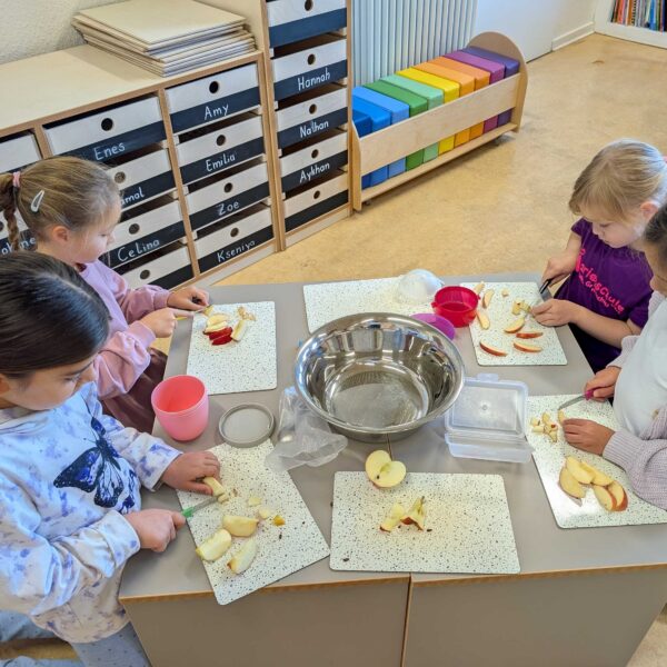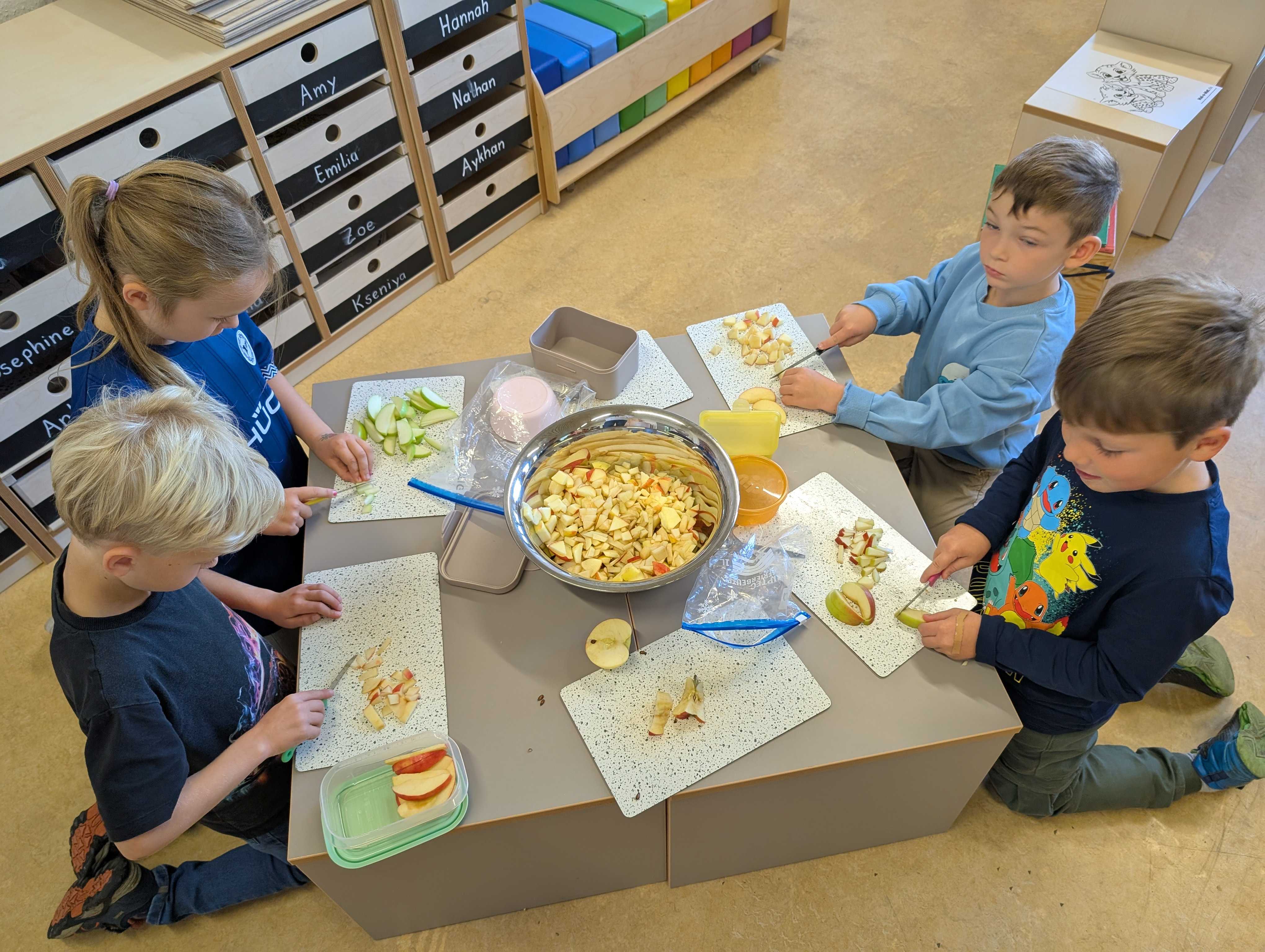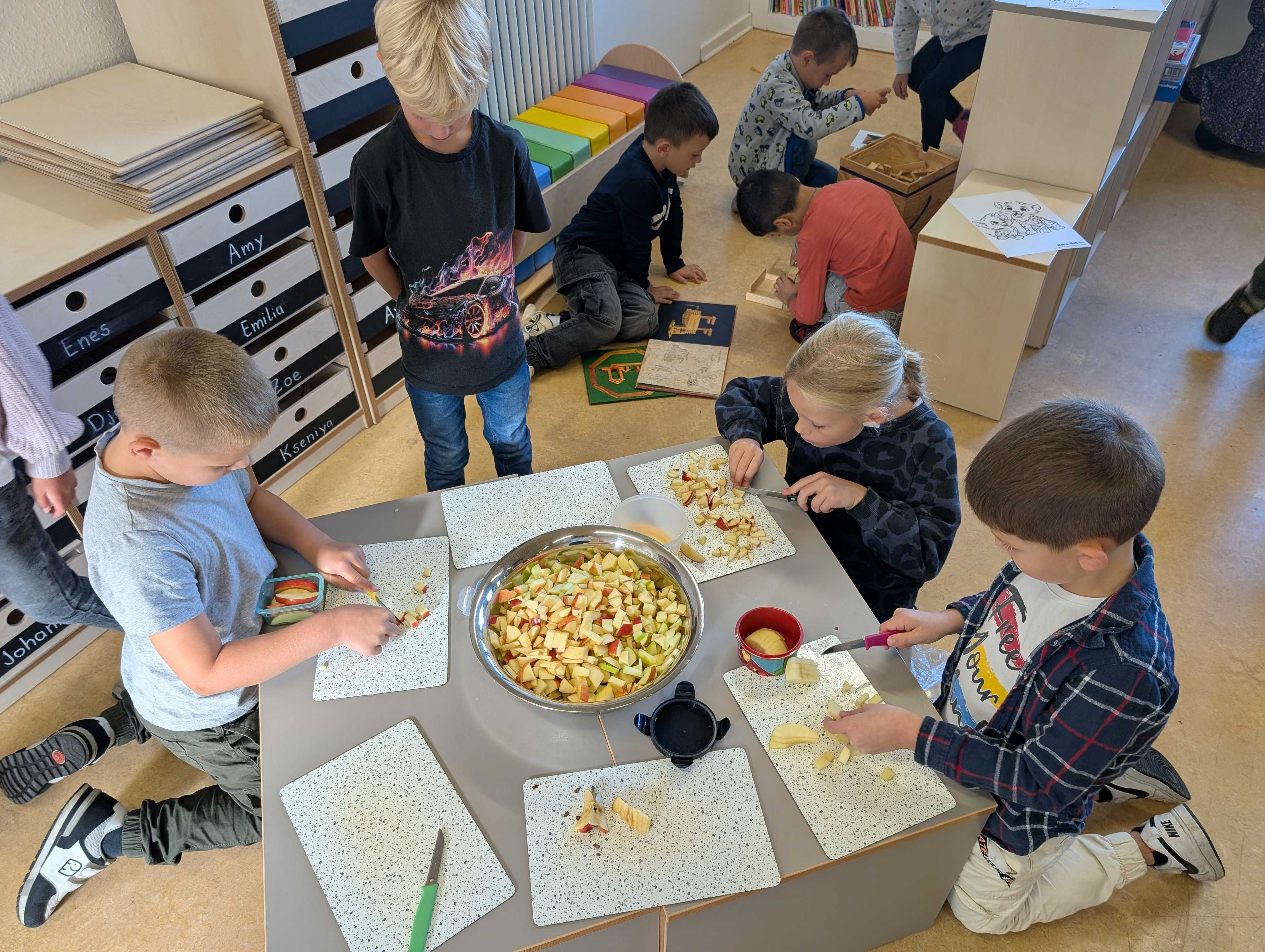 Den haben wir in kleinen Stücke geschnitten. Zum Schluss hatten wir eine große Schüssel mit Apfelsalat. Der war vielleicht lecker.