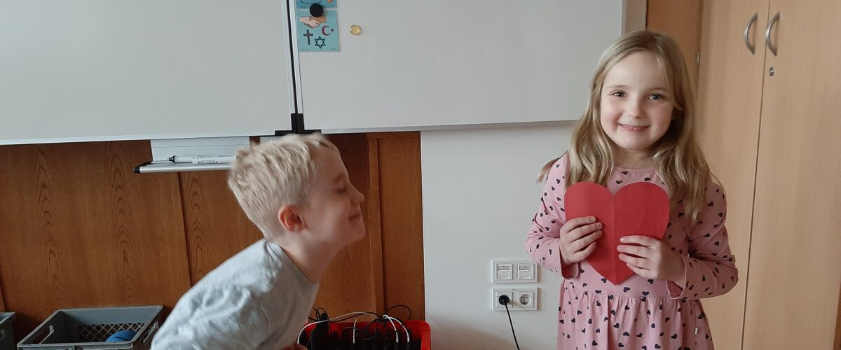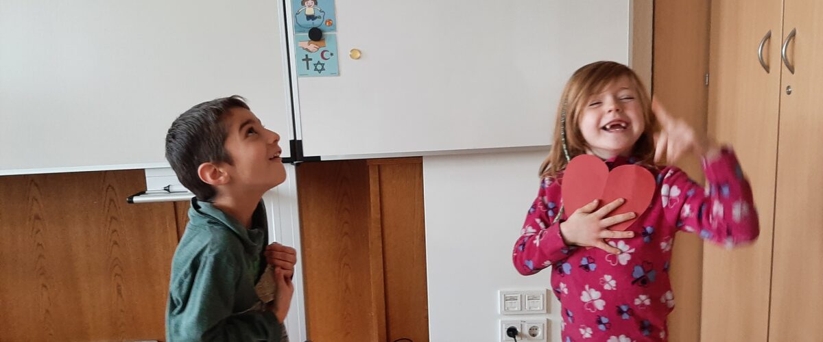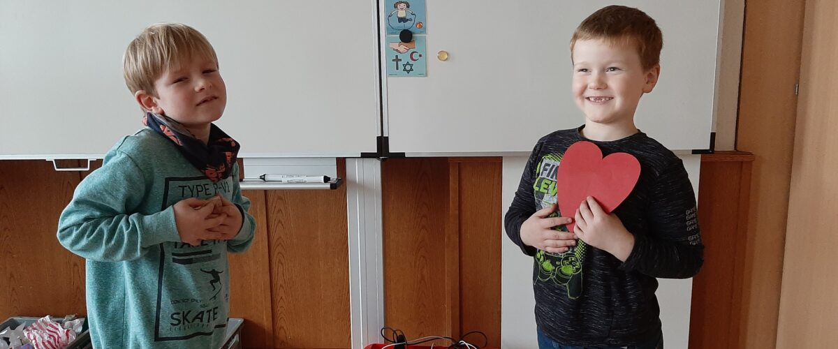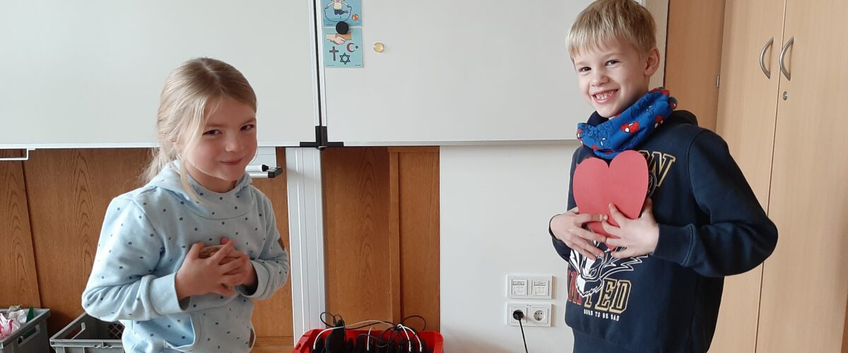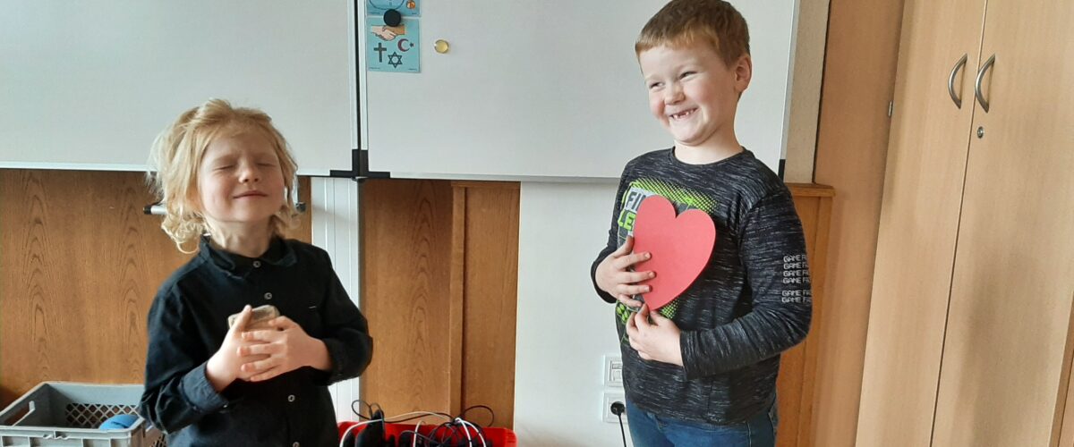 In Religion hören wir zur Zeit die Geschichte von Hinkefuß und einem jungen Mann. Der junge Mann möchte ganz schnell sehr reich werden. Da macht ihm Hinkefuß einen Vorschlag: „Gib du mir dein Herz und ich gebe dir mein steinernes Herz. Wenn du dich auf diesen Vorschlag einlässt, wirst du schnell reich werden.“ Der junge Mann ging darauf ein. Wir sollten nun diese Situation als Standbild darstellen. Einer von uns war Hinkefuß, der sich riesig freute, nun ein gutes Herz zu haben. Ein anderer von uns war der junge Mann, der sich ganz schlecht mit dem steinernen Herz fühlte. Wir sind schon ganz gespannt, wie die Geschichte weiter geht…